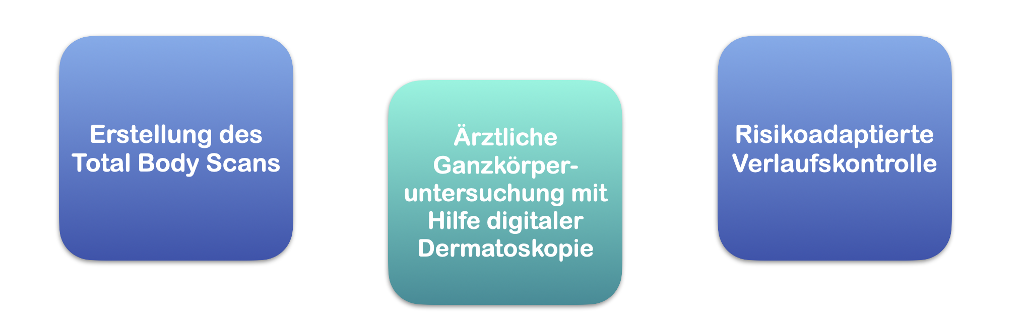 Präzise Erfassung und Analyse der gesamten Haut für höchstmögliche Sicherheit und Genauigkeit bei der Früherkennung von Hautkrebs. Der Vorteil eines Total Body Mappings zeigt sich insbesondere im zeitlich Verlauf. Bereits beim zweiten Termin können alle Hautveränderungen wie Muttermale oder Pigmentflecken millimetergenau über die Zeit hinweg miteinander verglichen werden.